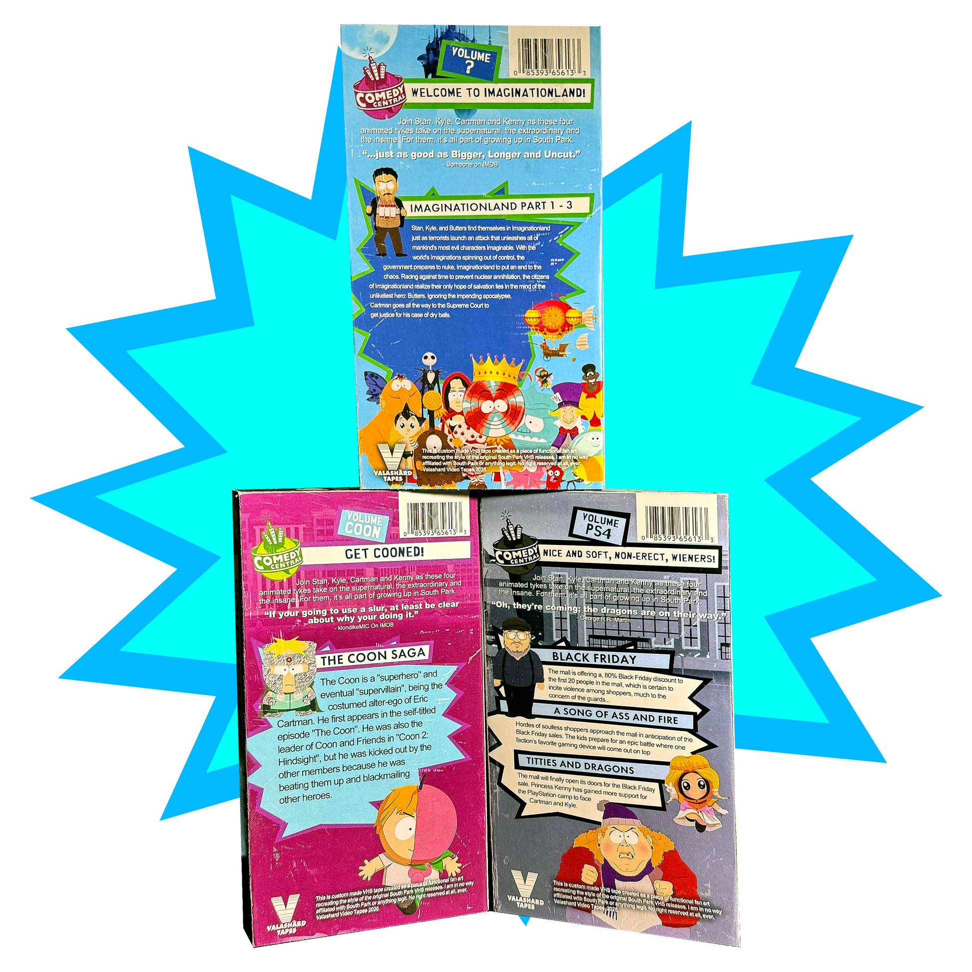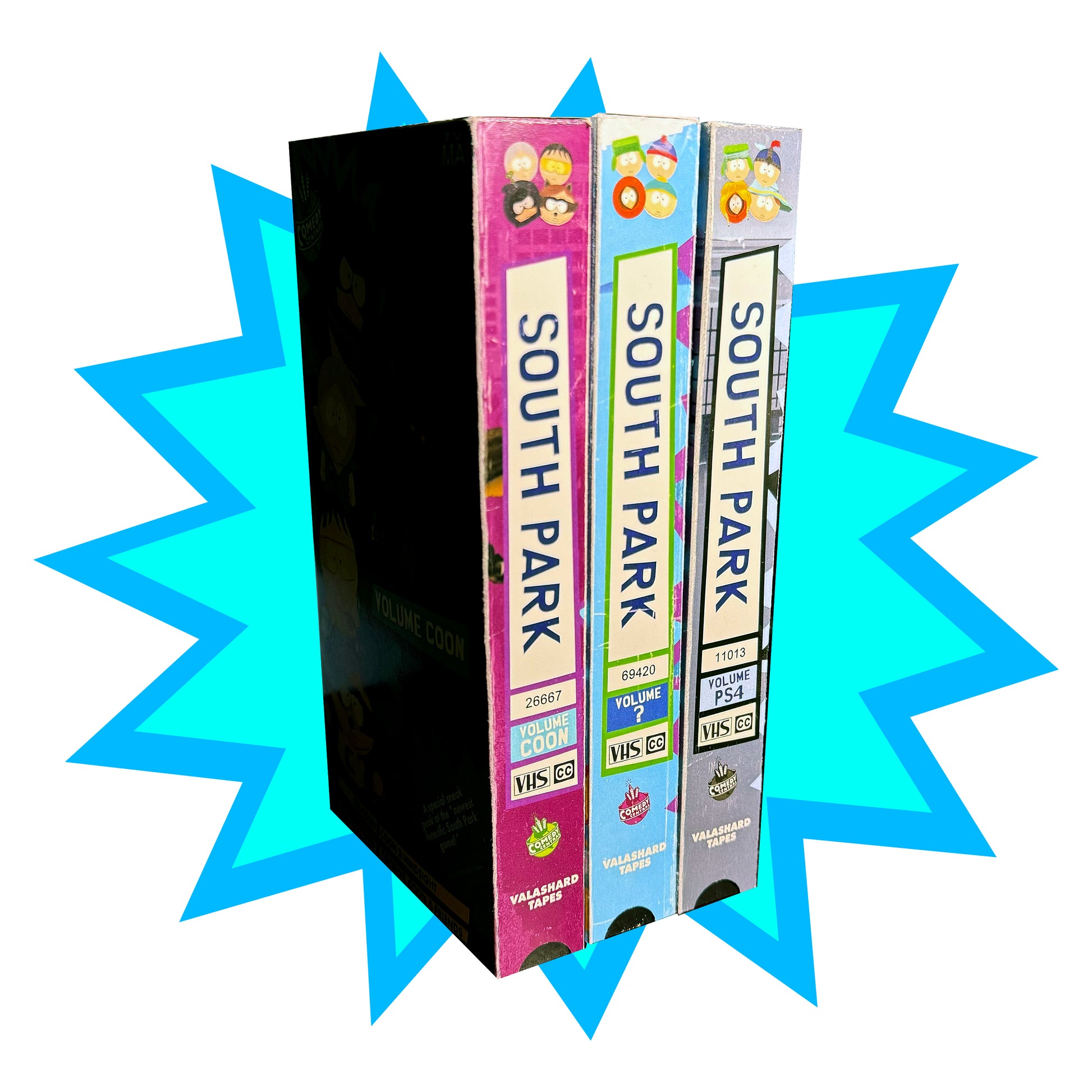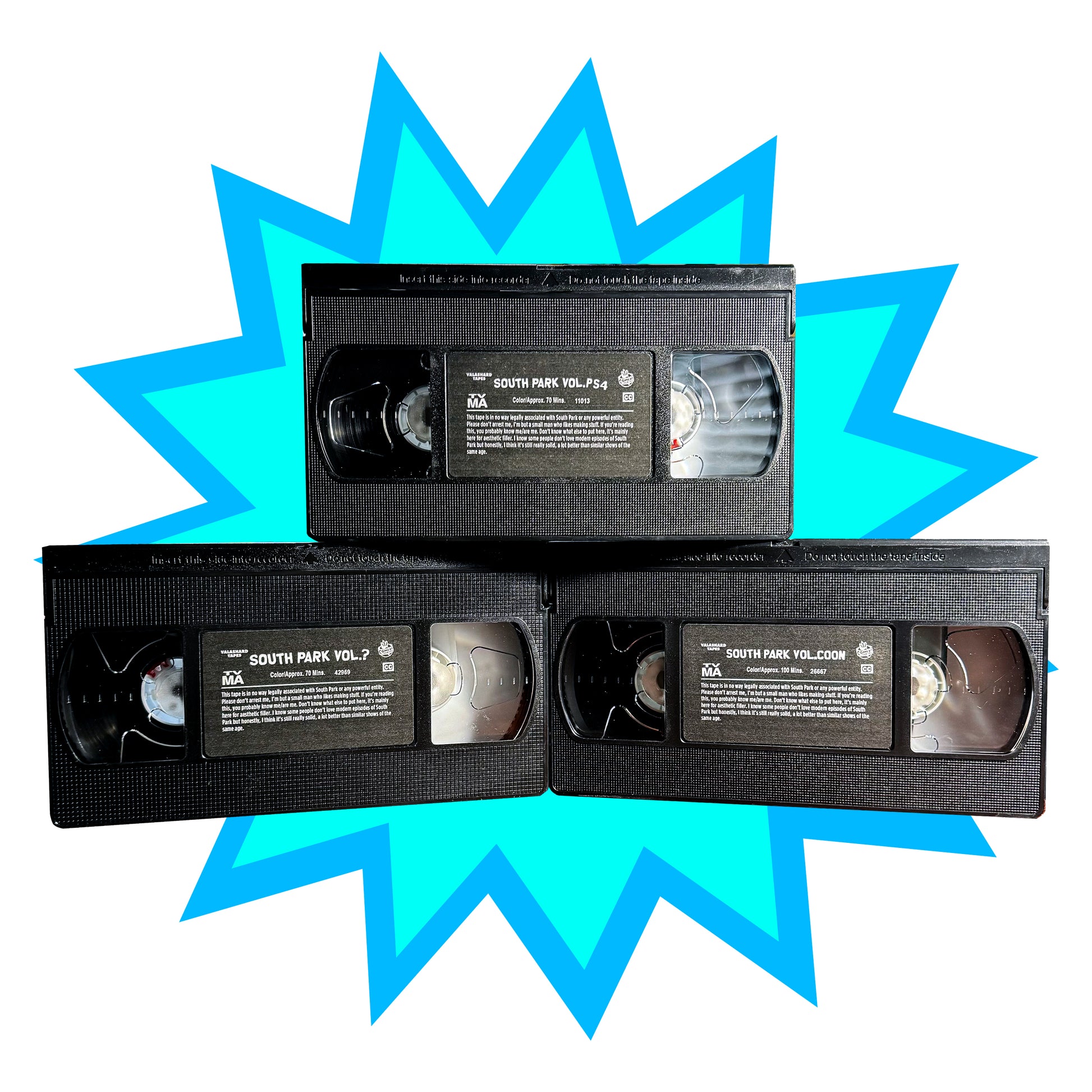 For a limited time these fan favorite South Park tapes are back! The set will fit in perfectly with the original releases, also I'm not sure why but the color and saturation of the overs looks a little funny when I took pictures of them, they look great in person I swear haha.